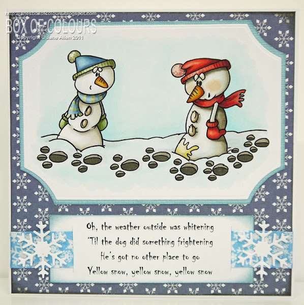 The sayingi s wonderful and the look on the snowmans face priceless! This is a wonderful card and I will have to refer back to it for a couple of christmas cards I have to send out this year. Thanks for the inspiration.